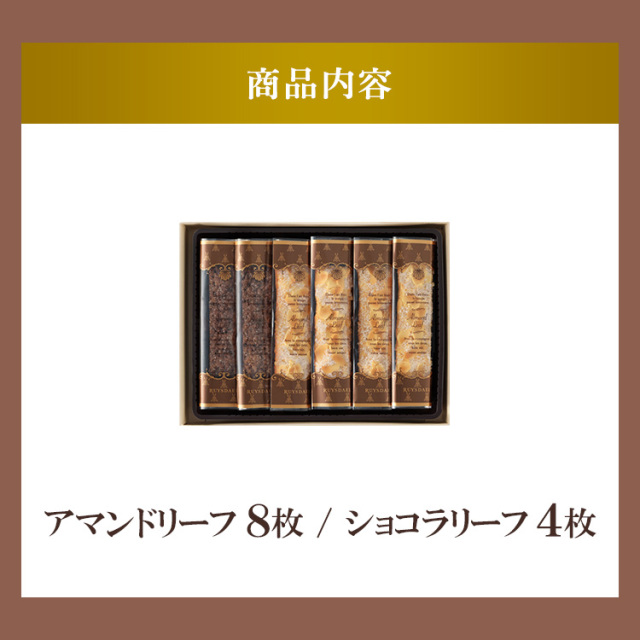 | 原材料 | 【アマンドリーフ】小麦粉(国内製造)、バター、砂糖、アーモンド、胡麻、食塩、香料(一部に小麦・乳成分・ごま・アーモンドを含む) 【ショコラリーフ】小麦粉(国内製造)、バター、砂糖、カカオマス、ココアパウダー、食塩/香料(一部に小麦・乳成分・大豆を含む) |