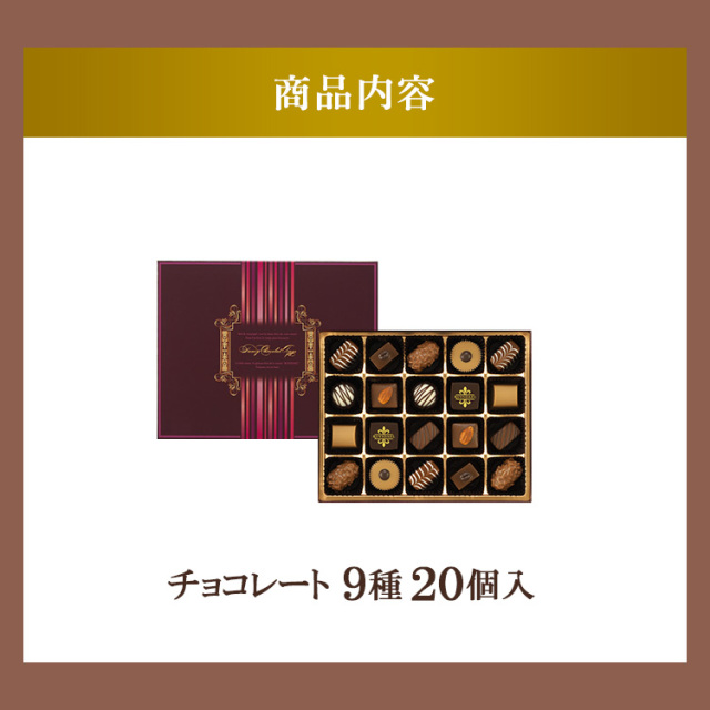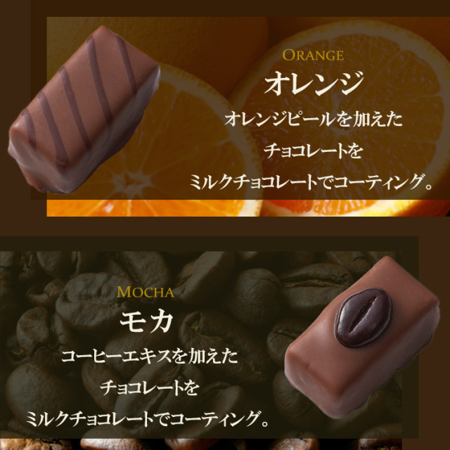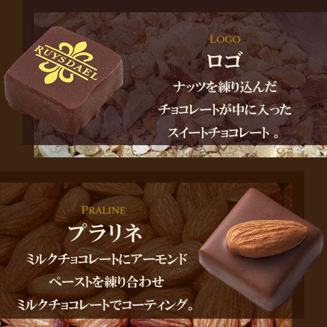 | 原材料 | チョコレート(国内製造、フランス製造、ベルギー製造)、砂糖調製品(砂糖、水飴)、バター、ココアバター、砂糖、アーモンド、アーモンドペースト、りんご砂糖漬け(りんご、砂糖、洋酒、水飴)、ヘーゼルナッツペースト、オレンジピール砂糖漬け(オレンジピール、砂糖、洋酒、水飴)、マカデミアナッツ、洋酒、レーズン、全粉乳、脱脂粉乳、カカオマス、コーヒーエキス(コーヒー、砂糖)、油脂加工食品(植物油脂、砂糖、全粉乳、その他)/乳化剤、香料、着色料(二酸化チタン、黄4、カカオ、青1、カラメル)、光沢剤、アラビアガム(一部に乳成分・大豆・りんご・オレンジ・アーモンドを含む) |