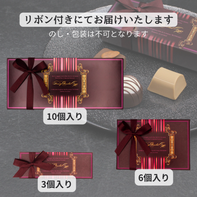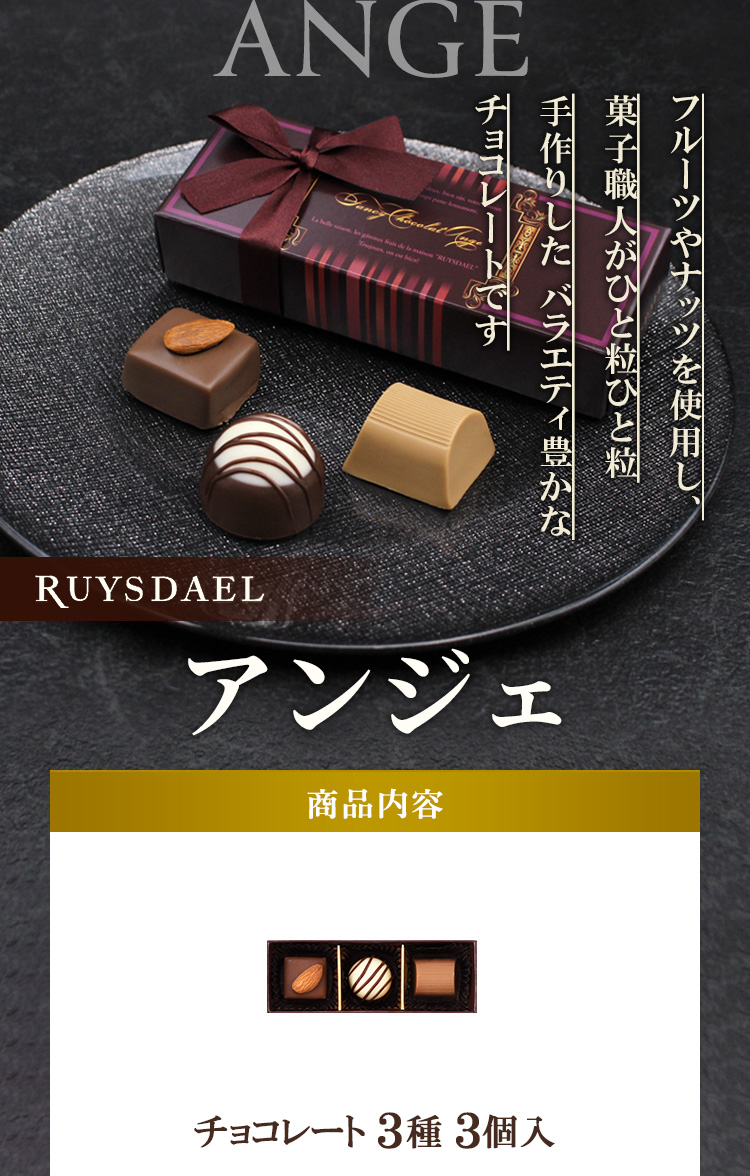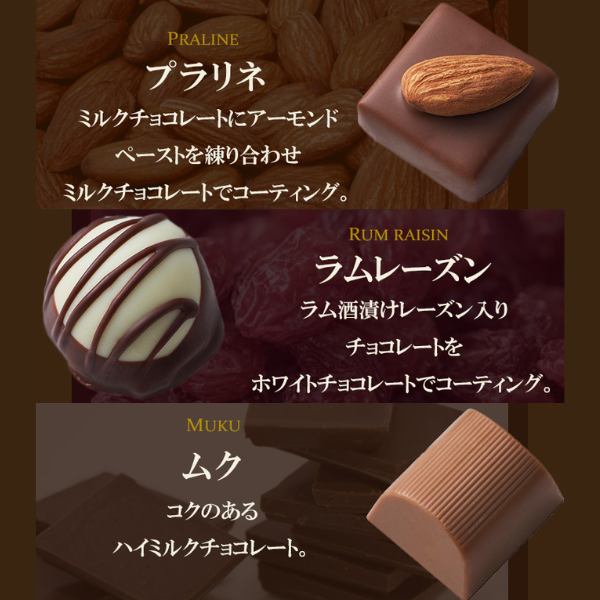 | 原材料 | チョコレート(国内製造、フランス製造)、アーモンド、砂糖調製品(砂糖、水飴)、バター、ココアバター、砂糖、レーズン、洋酒、乳化剤、香料(一部に乳成分・大豆・アーモンドを含む) |