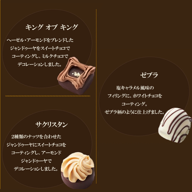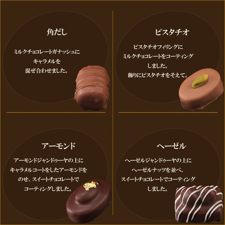 | 原材料 | チョコレート(国内製造、フランス製造)、砂糖、ヘーゼルナッツ、ココアバター、クリーム、アーモンドペースト、ピスタチオナッツペースト、ヘーゼルナッツペースト、チョコレートスプレッド(チョコレート、食用精製加工油脂、乳脂)、植物油脂、アーモンド、ピスタチオナッツ、小麦粉、全粉乳、キャラメルバウダー(ホエイ、バター、マルトデキストリン、砂糖、脱脂粉乳)、脱脂粉乳、カカオマス、水飴、バターオイル、ホエイパウダー、食塩、乳糖、バター、大麦モルト、乳化剤、香料、ソルビトール、着色料(金箔)、(一部に小麦・乳成分・大豆・オレンジ・アーモンドを含む) |