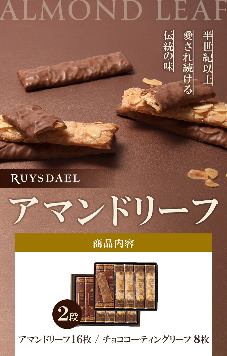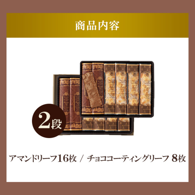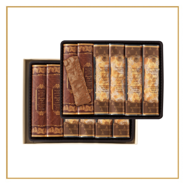 たっぷりのバターを折り込んだ生地にスライスアーモンドと シュガーをトッピングした極上のパイ「アマンドリーフ」と、バターの豊かな味わいとサクッと軽い食感のパイに滑らかなミルクチョコレートをコーティングした「チョココーティングリーフ」の詰合せ。