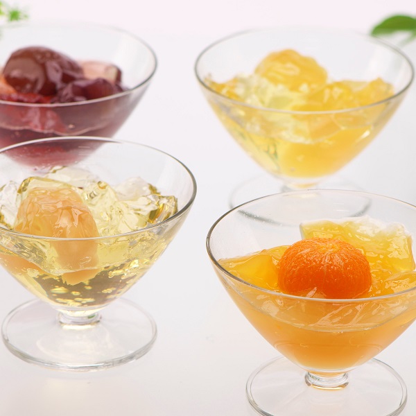 産地にこだわり、選びぬかれた新鮮な果実のゼリー。 洋酒を使用し、素材本来のおいしさを引き出しています。 和歌山県産みかん、岡山県産ピオーネ、山形県・青森県産白桃、山形県産ラ・フランスの4種類のお味です。