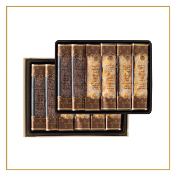 シュガーをトッピングした極上のパイ「アマンドリーフ」と、チョコレートを生地に練り込んだカカオの香ばしさと苦みが味わえる「ショコラリーフ」の詰合せ。